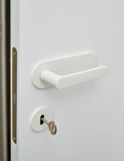Πλαίσιο πόρτας ξύλινο, τύπου FINGERJOINT γεμισμένο µε σταθεροποιητικό πυρήνα HONEYCOMB. Η πόρτα είναι καλυμμένη και από τις δύο πλευρές µε MDF ΠΑΧΟΥΣ 6mm.